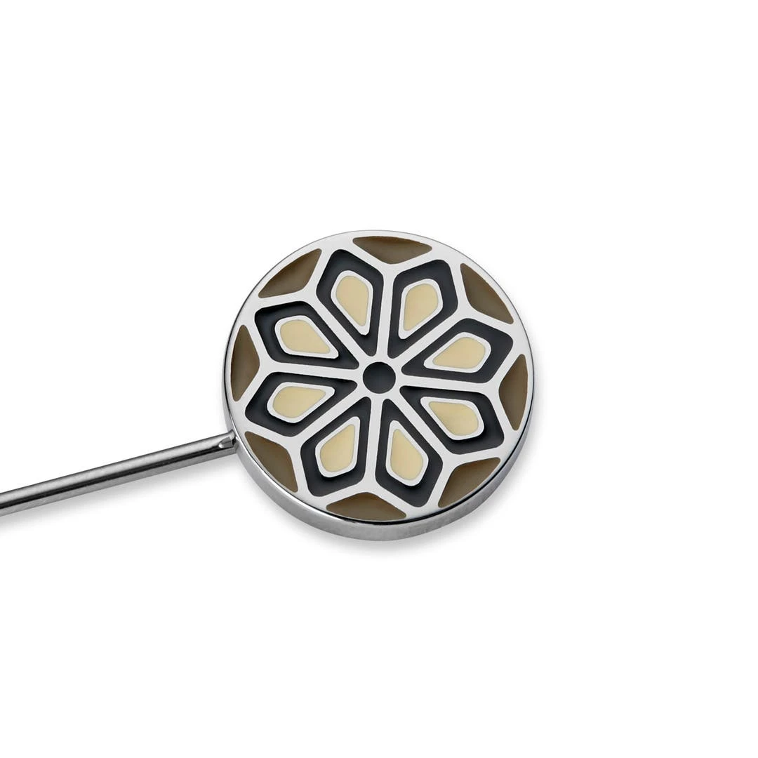 Cette boutonnière de conception danoise présente un design géométrique complexe et une combinaison de gris, bleu marine et blanc cassé – une touche élégante pour tous les goûts.