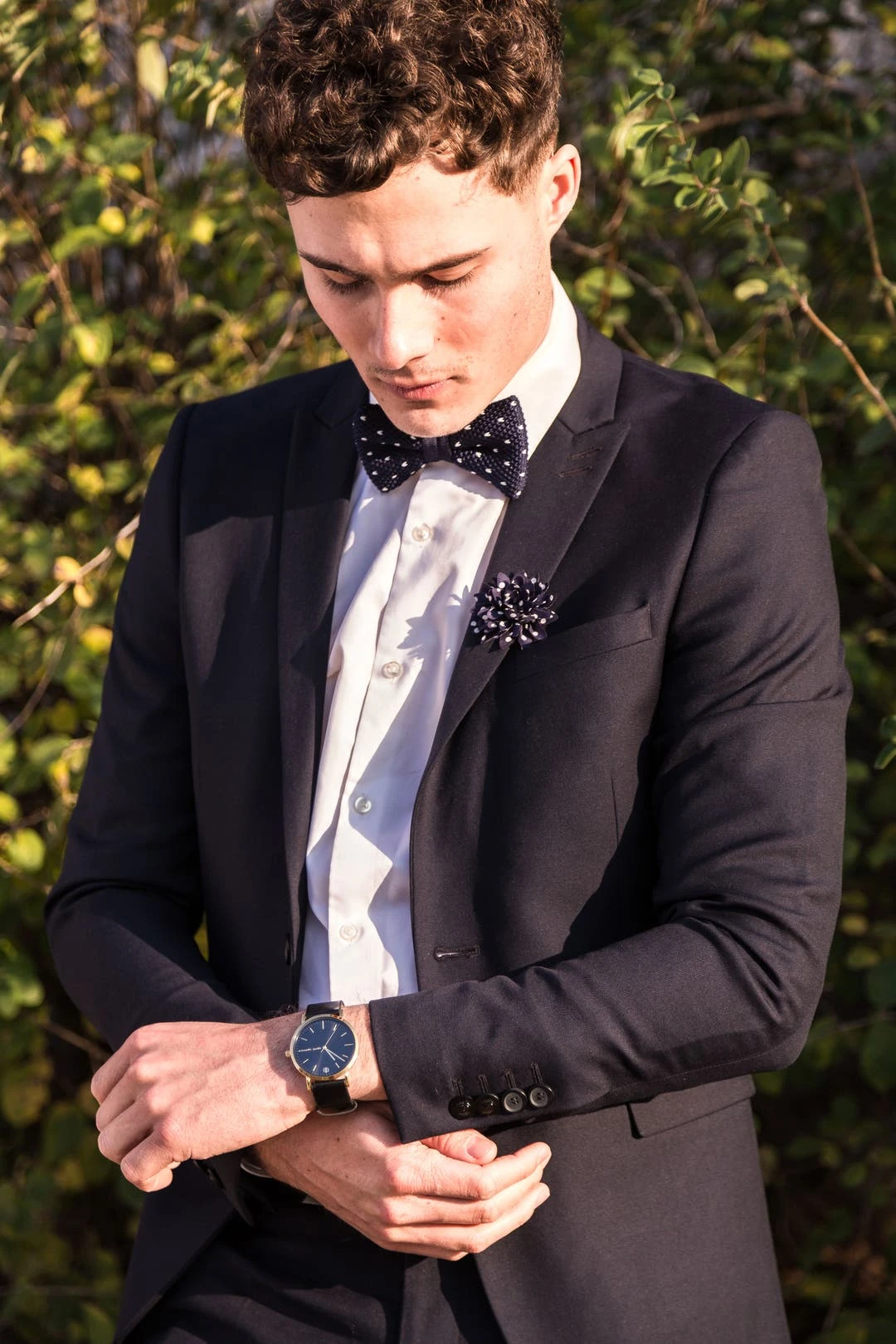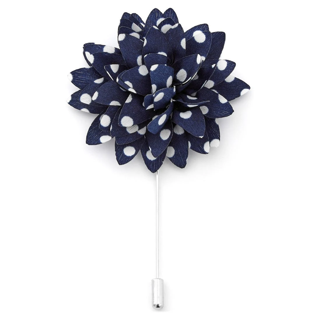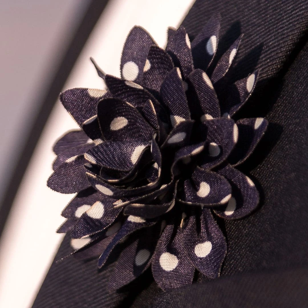 Quoi de plus attrayant que des pois blancs sur un fond bleu marine ? Cette boutonnière à fleur a été conçue pour les hommes amoureux d’accessoires raffinés.
