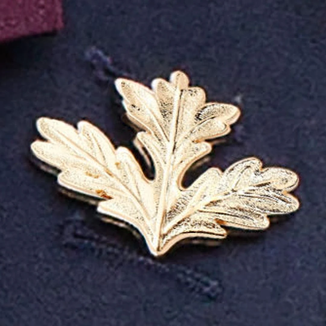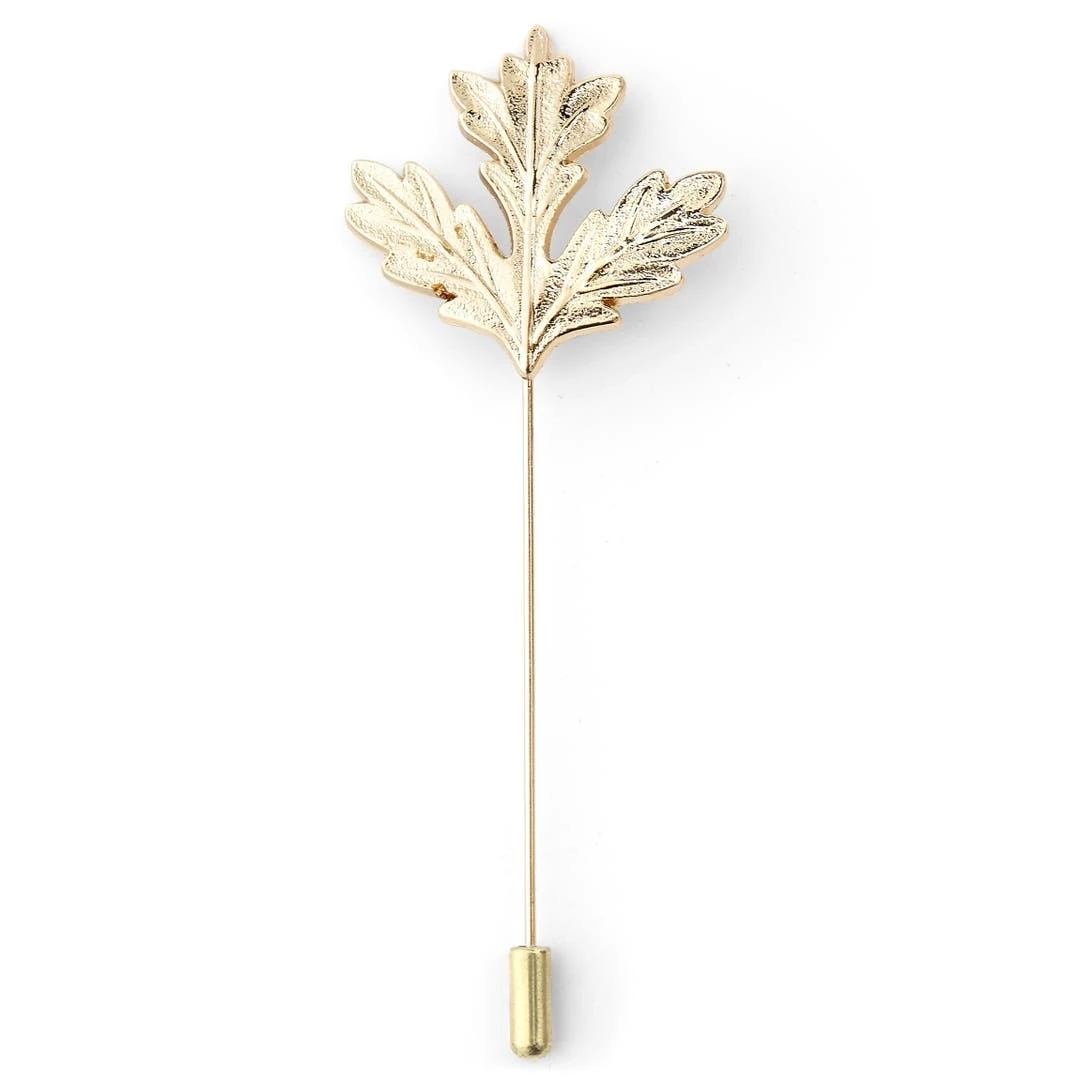 Une boutonnière élégante, sobre et raffinée représentant une feuille de chêne dorée. Entendez-vous l’appel de la nature ?